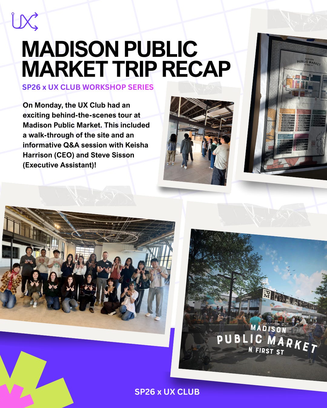 On Monday, the UX Club had an exciting behind-the-scenes tour at Madison Public Market. This included a walk-through of the site and an informative Q&A session with Keisha Harrison (CEO) and Steve Sisson (Executive Assistant)!